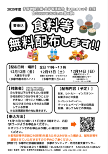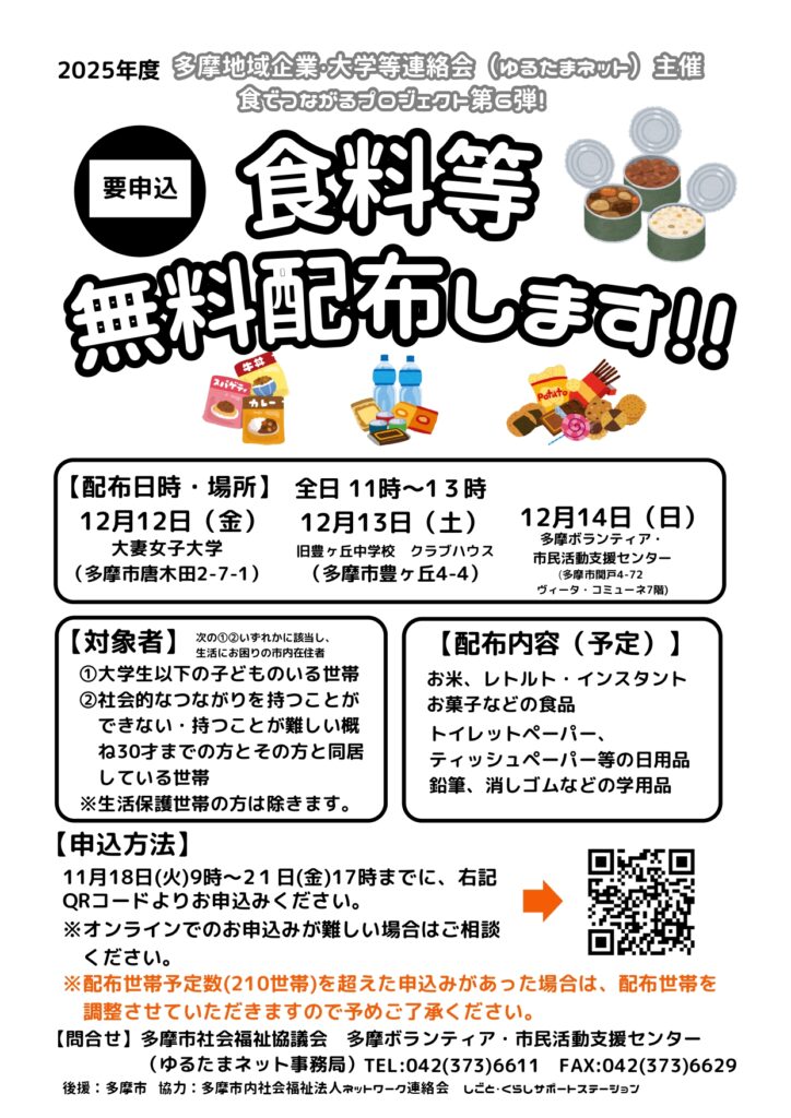 多摩地域企業・大学等連絡会(ゆるたまネット)主催で、多摩市内在住で対象者①②いずれかに該当し、生活にお困りの世帯へ食料等無料配布を行います。